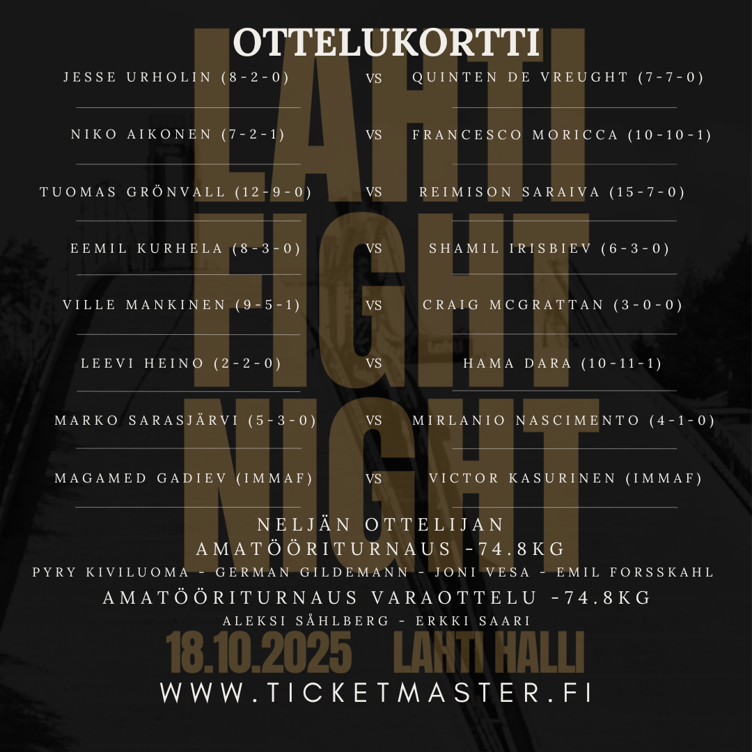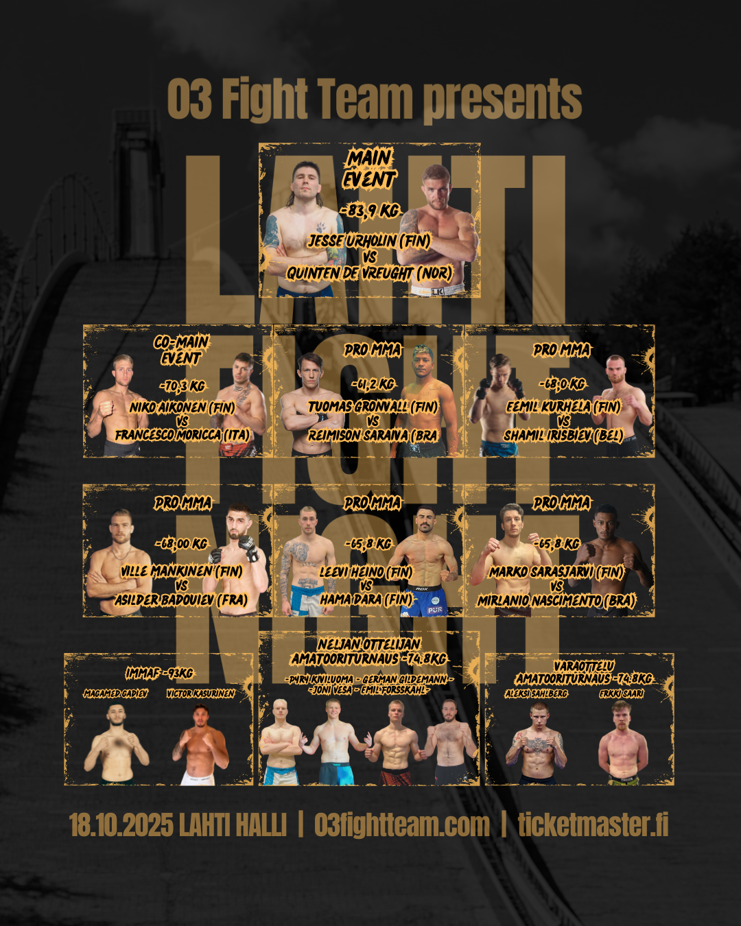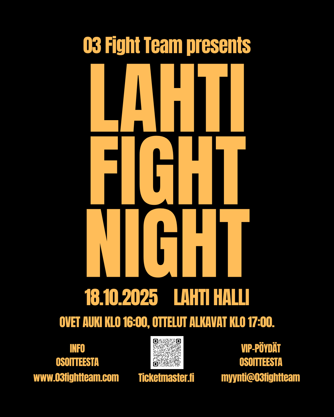 Yli kymmenen vuoden tauon jälkeen vapaaotteluhäkki palaa kaupunkiin, kun Lahti Fight Night sytyttää Lahti Hallin liekkeihin 18.10.2025. Ovet auki klo 16:00 alkaen ja ottelut starttaa klo 17:00.